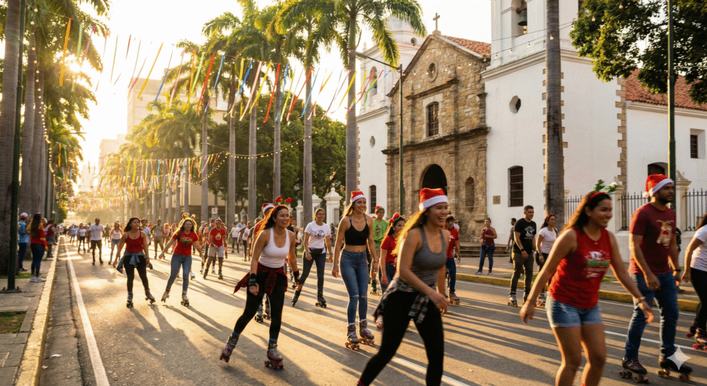 En Caracas, la capital venezolana, existe una tradición única y divertida: las “Patinatas”. Durante la temporada navideña, muchas calles se cierran al tráfico temprano en la mañana para que la gente pueda ir a las misas de aguinaldo patinando. Es una fiesta callejera llena de música, comida y alegría sobre ruedas.